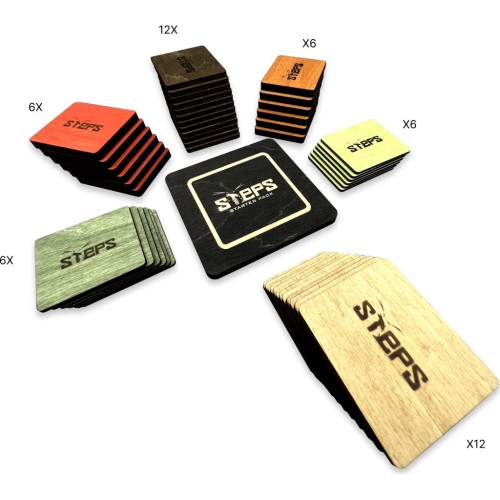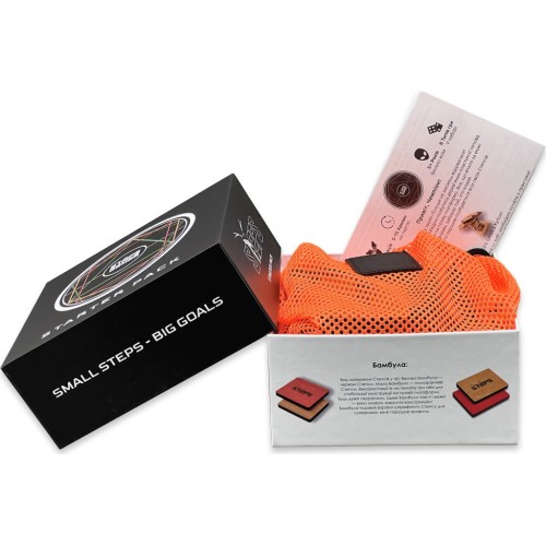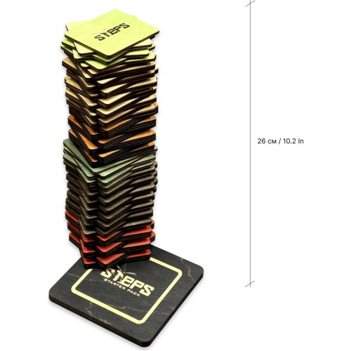 Степс. Стартер (Steps Starter Pack): добрий початок В українській культурі настільних ігор семимильними кроками просувається незвичайна та захоплива серія динамічних настільних ігор STEPS. Це новий погляд на зведення високих веж, уміння виявити свій азарт, логіку, спритність та почуття балансу. Новачки серед різноманіття Степсів губляться і не знають, як правильно навчитися метати дерев'яні пластини. Всі ми проходили перші уроки з випуском Степс: Класичний (Steps Classic), удосконалюючи свої навички з кожним наступним виданням. Якщо ви тільки стаєте на шлях степсометателів або вже стали колекціонером чудового виду настілок, у вас з'явилася можливість випробувати легше видання Степс. Стартер (Steps Starter Pack). Це полегшена версія порівняно з класичними степсами. Кількість пластин у Стартері менша, також вони дещо зменшені у розмірах. Залишається незмінною якість компонентів, базові правила та чудовий настрій під час партії. Настрій улови, степсів гору зведи! У вже традиційному стилі Степсів 1-6 гравцям доведеться вибудовувати максимально високі вежі, кидаючи дерев'яні пластини. Перед початком партії всім гравцям належить отримати однакову кількість степсів усіх 6-ти видів. Ігрове поле розташовується у загальній доступності на стійкій поверхні з урахуванням можливості кидка. Визначивши першого гравця за допомогою кидків кубика, гравці ходять по черзі. Щоразу, кидаючи степс, враховуйте основні вимоги: бамбули (найважчі пластини) краще використовувати на початку зведення вежі, а більш легкі степси – відправляти на самий верх конструкції; рука під час кидка повинна рухатися знизу вгору; кожен новий степс у вежі має стикатися з попереднім; при будь-якому промаху: перекидання, не дотримання правил дотику тощо, гравець забирає щойно кинутий степс назад. При цьому наступний учасник, за наявності такої можливості, може почати зводити нову вежу; той, хто своїм кидком звалить конструкцію, як штраф забирає собі всі пластини, що впали. Також у грі діє ціла система штрафів. Особливо вона жорстока для гравця, який має останній степс. Він має бути відправлений на конструкцію з переворотом 180 градусів. Так, це дуже складно, але цілком можливо. А якщо вам захочеться різноманітності, правила дозволяють грати на час, командами, з використанням різних ускладнень і т.д. Степс. Стартер: розвивай почуття балансу та спритності! Настільна гра Степс. Стартер відкриє вам цілий всесвіт Степсів, допоможе познайомитися з принципом гри, потренуватися, вникнути у правила, механіку та загальні принципи поведінки дерев'яних пластин. Декілька партій тренування і ви вже сміливо зможете зробити наступний крок і проявити себе у складніших варіантах гри. Розвивайте логіку, спритність, координацію рухів та швидкість реакції, а також згадуйте закони фізики. А який азарт захопить кожного учасника під час партії! Це потрібно просто відчути на собі. Купити настільну гру Степс. Стартер варто любителям азартних настілок з непередбачуваним завершенням, де важливі як власні вміння, так і воля випадку. Додатково всі охочі можуть придбати Персональний степс із гравіюванням, який неодмінно стане вашим щасливим білетом до переможного завершення партії. Почавши зі Стартера, ви не зможете зупинитися і неодмінно захочете випробувати інші степси, наприклад, з Трикутним або П'ятикутним випусками. В