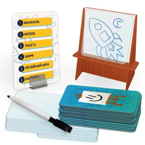 91 карта; 25 прозорих аркушів; 1 маркер, що стирається; 1 підставка; 1 мольберт; 1 правила гри