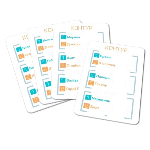 Картки зі словами, які ми показуватимемо і відгадуватимемо, замішуються в колоду і викладаються обличчям вниз. На кожній картці вказані завдання трьох рівнів складності, подані парами слів.