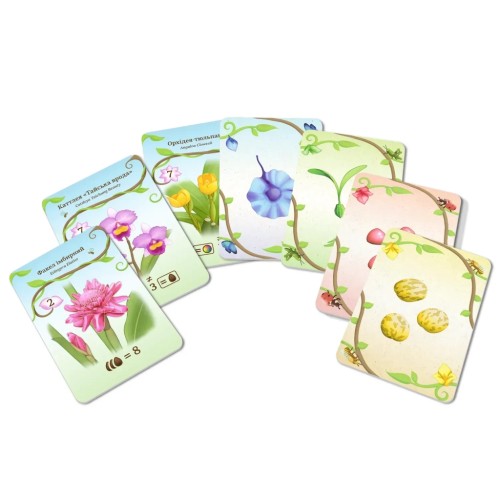 1 правила гри, 12 карт орхідей, 30 карт флори, 64 карти насіння, 5 карт-підказок