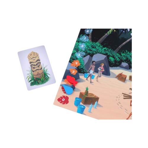 Ігрове поле, де зазначаються запаси води, риби і деревини, у всій красі показує нехитрі заняття мешканців острова. До стосу карток погоди замішують карту урагану. В мішечок кладуть кульки.