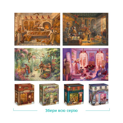 Особливість цієї серії полягає в тому, що пазли знаходяться в коробках-фасадах. Відкривши коробку, ви потрапите у внутрішній світ квіткової крамниці, а кожен елемент пазла дозволить вам глибше поринути у цю атмосферу неймовірної краси та тепла.