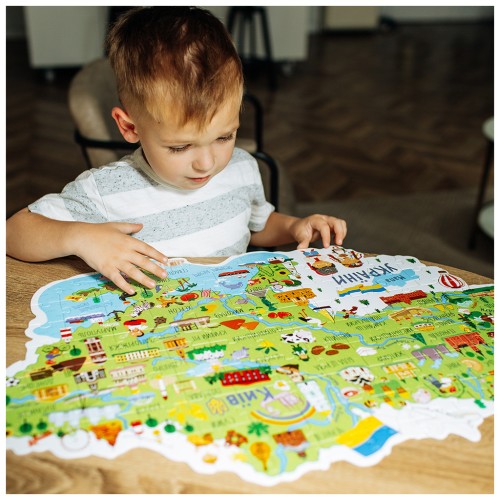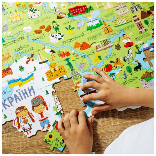 Дізнаємося більше про рідну Україну! Які відомі пам’ятки архітектури є у кожному регіоні, які тваринки населяють нашу країну, та які цікаві місця варто відвідати. Пазл виконаний з щільного картону, яскравий та зручний для гри. Ідеальний подарунок для маленьких дослідників та мандрівників.
