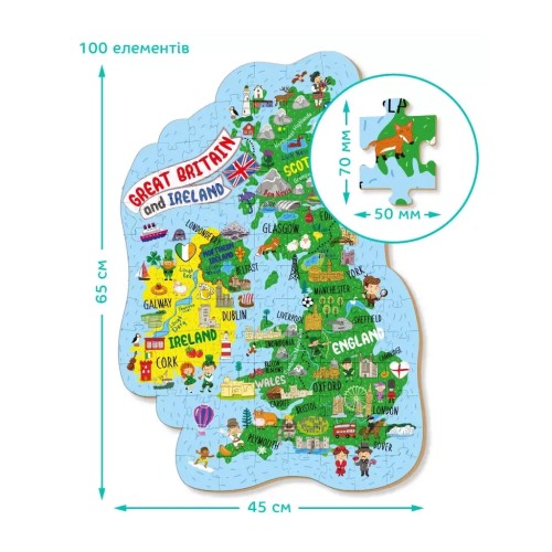 Лімітоване видання! Ідеальний подарунок для малят, що хочуть дізнатися більше про Великобританію та Ірландію. Яскравий фігурний пазл з головними цікавинками островів: містами, горами та історичними пам'ятками. Зможете знайти короля Артура? Стоунхендж? Чи чудовисько озера Лох-Несс? Малята зможуть вивчати назви, читати англійською та дізнаватися нове. Поспішайте замовляти.