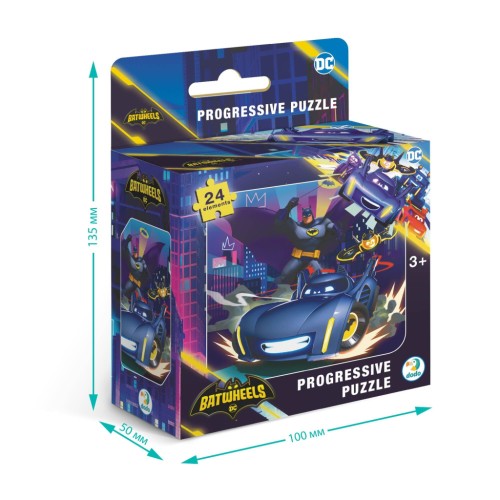 Пазл Dodo "Batwheels: Бетмобіль Бам" складається з 24 елементів і є частиною серії Progressive, що спеціально розроблена для наймолодших дослідників. На яскравій ілюстрації зображено захопливий момент: Бетмен разом зі своїм надійним бетмобілем Бамом та літальним апаратом Batwing у повній бойовій готовності на захисті міста.