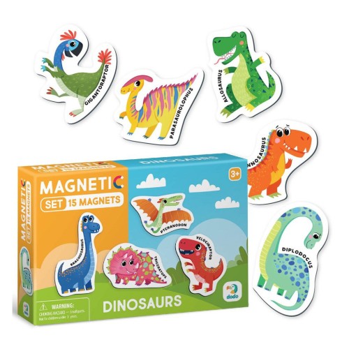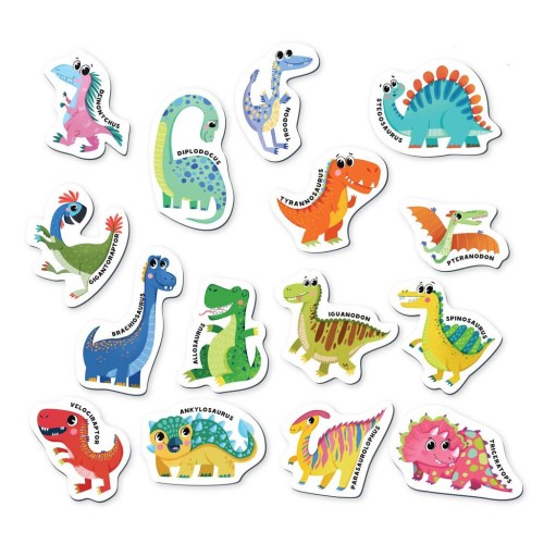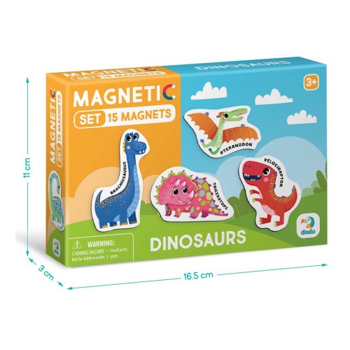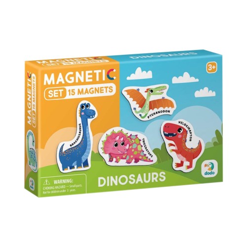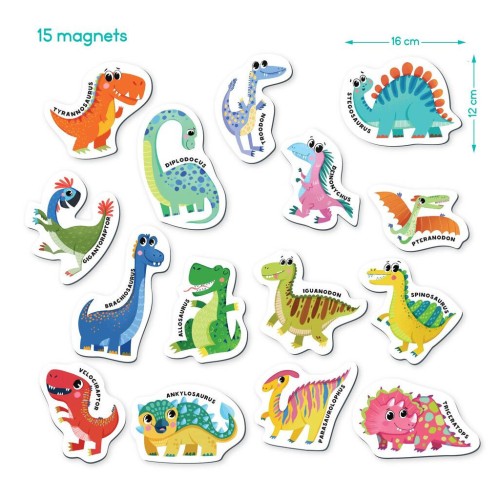 У наборі містяться 15 магнітів, кожен з яких представляє собою різних динозаврів. Кожен магніт супроводжується назвою динозавра, що сприяє розвитку мовних навичок дітей та розширює їхні знання про цих захопливих істот. Магніти легко прикріплюються до магнітної поверхні, що робить навчання цікавим та інтерактивним.