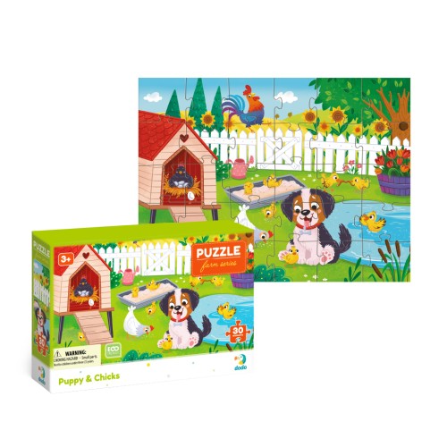 Пазл Dodo «Цуценя та курчата» – це яскрава та весела настільна гра для малюків від 3 років. Складаючи 30 великих картонних елементів, дитина створює милу картинку із цуценям, курочками та курчатами на затишному подвір’ї.