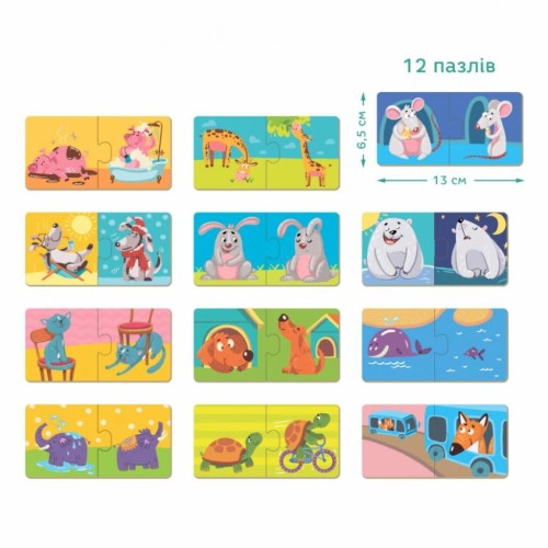 У грі 12 пазлів, кожен із яких складається з двох елементів, потрібно знайти до кожного елемента парний, щоб утворилося 12 тварин.