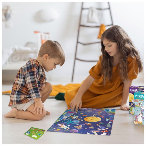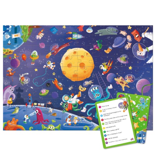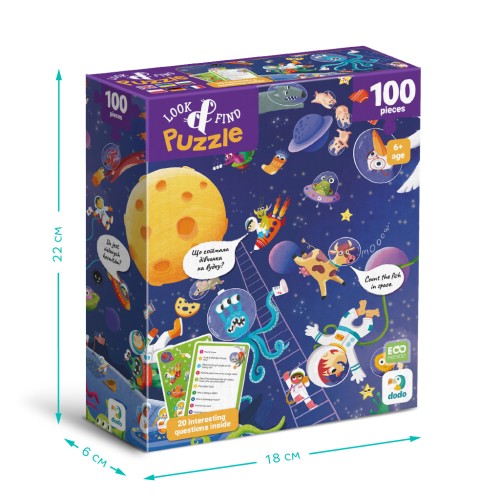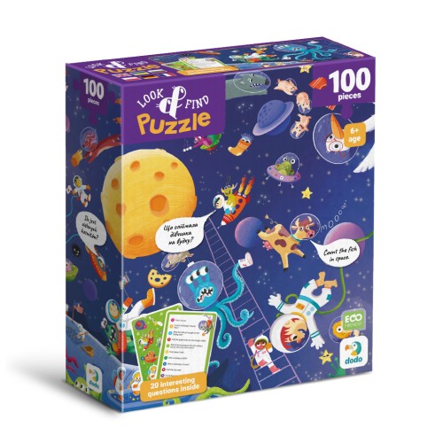 Шукаєте цікавий та розвиваючий пазл для дітей? Подаруйте малюку справжню новорічну пригоду з пазлом "Look & Find Шалений космос" від бренду Dodo! Цей розвиваючий пазл на 100 елементів поєднує складання з веселою грою на уважність: після завершення картинки дитина має знайти заховані об’єкти за підказками на спеціальних картках.