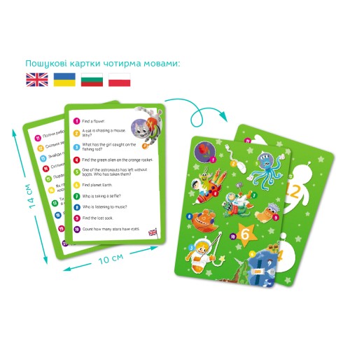 • 2 двосторонні картки із завданнями (Look & Find) на 4 мовах (англійська, українська. польська, німецька)