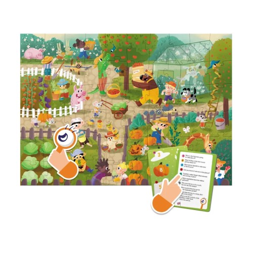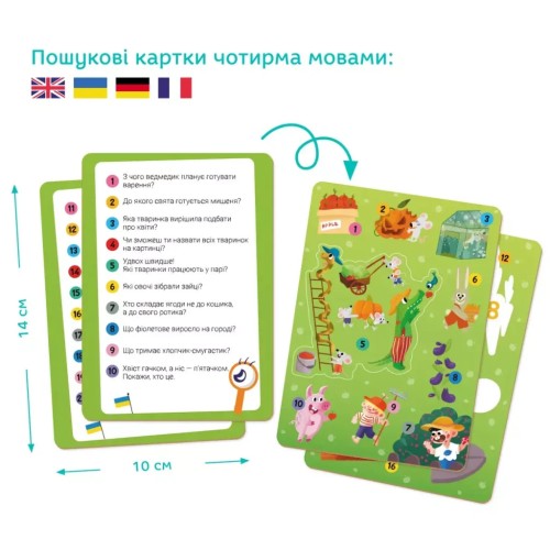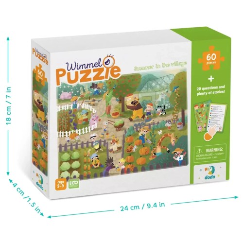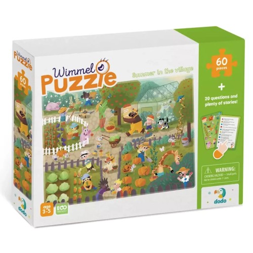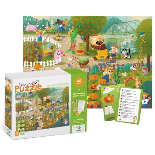 Як згадати, яке воно - літо в селі? Є два варіанти — можна дочекатися літа та гайнути до бабусі на черешні, або скласти наш пазл із зображенням трудових сільських буднів, де люди працюють разом із тваринками. На ньому так багато персонажів, що очі розбігаються у різні боки. Як думаєте, зможете знайти всіх? Особливість вімель пазлу — кількість елементів на зображенні, адже пазл буквально кишить персонажами. Задача дитини — знайти потрібний елемент, який зазначений на картці із завданнями. Гра з таким пазлом вчить малечу кмітливості та концентрації уваги.