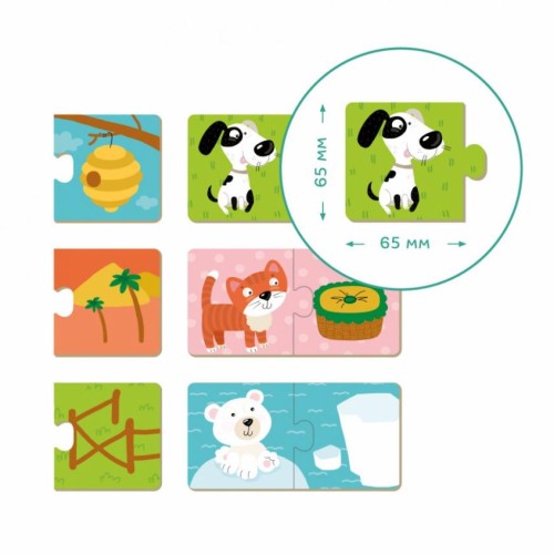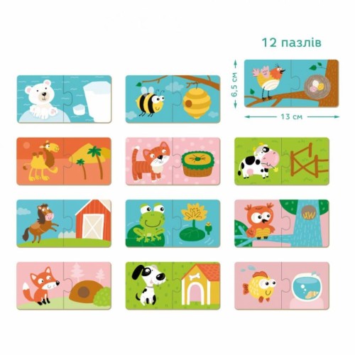 У грі 12 пазлів, кожен із яких складається з двох елементів, треба з'єднати елементи так, щоб кожній тварині відповідав будиночок.