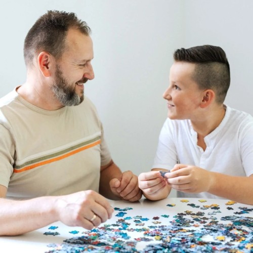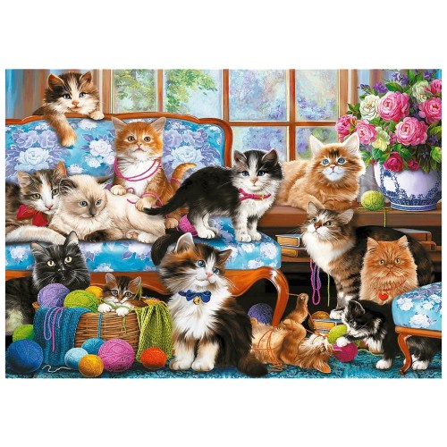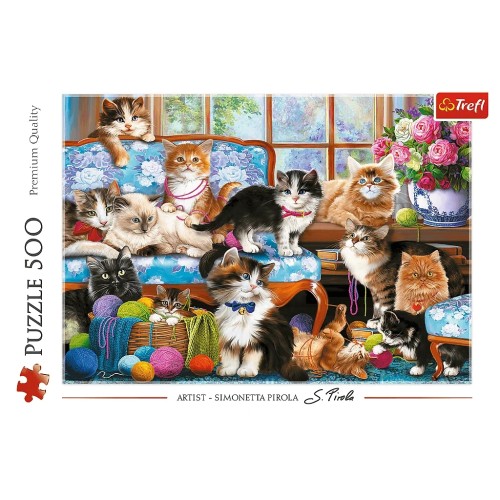 Пазли на 500 елементів з зображенням котиків. У складеному вигляді розмір картинки становить 48х34 см. Висока якість, насиченість кольорів і безпеку при складанні пазлів забезпечує спеціальний каландрований картон, який відображає світло і покритий екологічними фарбами.