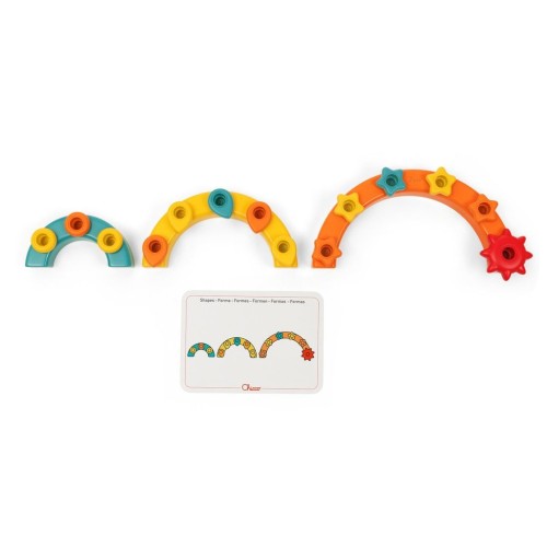 • Комплект містить 27 елементів, серед яких: основа-веселка з трьома дугами, сонце, хмаринка, 20 кольорових формочок (зірочки, краплі дощу, півмісяці та різнокольорові кружечки), 2 двосторонні ілюстровані картки із завданнями та мішечок для зберігання.