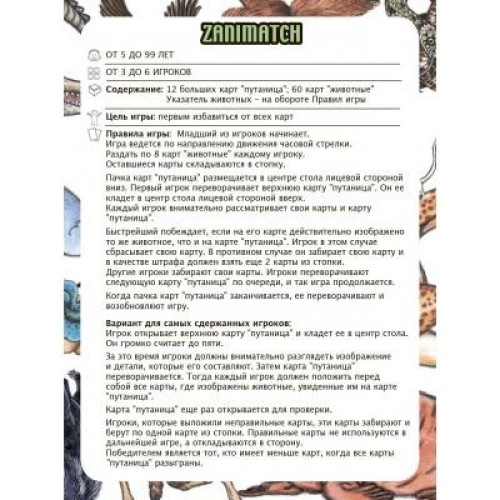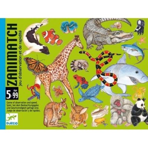 Розвиваюча іграшка Djeco Занималка (DJ05153) - карткова гра на уважність і прудкість реакції. Гравець отримує 8 карт на яких зображені тварини. На великій заплутаній карті потрібно знайти знайомих тварин і першим скинути карту відшукавши своє звірятко. Це і є виграш.