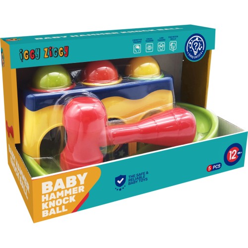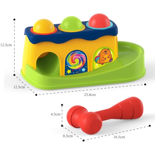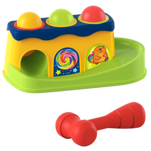 Комплект складається з 3-х кольорових кульок, молотка та яскравого корпусу, в якому є 3 кольорові отвори.