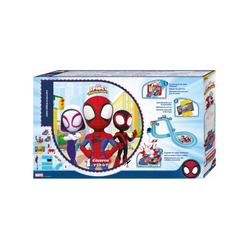 Пітер Паркер приєднується до свого друга Майлза Моралеса - або Спін - із серії «Павук та його супердрузі» і по-справжньому натискає на газ на 2.9-метровій трасі. Гоночна траса Carrera FIRST пропонує юним гонщикам серйозні випробування – включаючи швидкісні прямі, повороти, вузькі ділянки – та море задоволення! Перекидні елементи мають привабливі емблеми Павука на яскраво-синій трасі. Гру збагачують декоративні елементи із мотивами із серії.