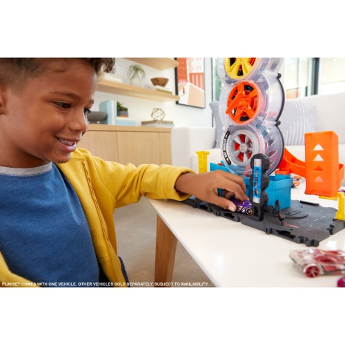 До комплекту входить одна машинка Hot Wheels, проте по шиномонтажній майстерні можуть одночасно гасати до чотирьох машинок (додаткові машинки продаються окремо). З реалістичними деталями (як-от ліфт, що активується самими дітьми, шини, що обертаються, і бензоколонка) вигадувати різноманітні пригоди ще цікавіше.