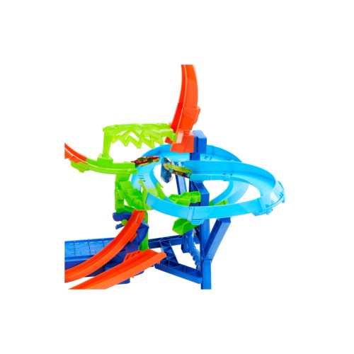 Запустіть машинку Hot Wheels, що входить до комплекту, і вона миттєво злетить у стрибок, промчить крізь петлю, подолає ще один трамплін та круті віражі, а потім автоматично повернеться на старт для нового заїзду.