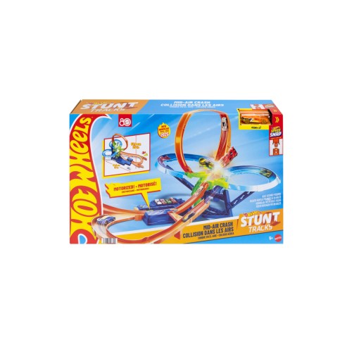Влаштовуйте гонки, виконуйте трюки та створюйте видовищні аварії з ігровим набором Hot Wheels Stunt tracks Неймовірні повітряні зіткнення, що оснащений моторизованим прискорювачем та компактно складається для зручного зберігання.