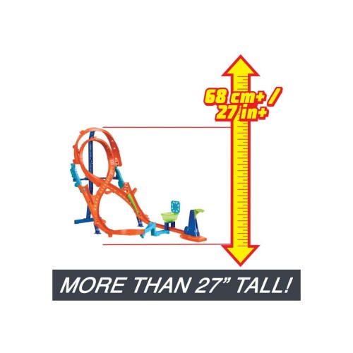 Перш ніж завантажити пускову установку та відправити транспортний засіб Hot Wheels, що входить до комплекту, навколо траси висотою понад 60 см, обов’язково перемістіть перемикач