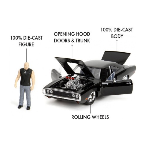 Зазирнути у середину автомобіля тобі дозволять відкривні дверцята. Рухається завдяки механізму вільного ходу коліс. Автомобіль доповнений унікальною металевою фігуркою Доменіка Торетто, яка виконана з ретельною деталізаціэю. Цей набір стане чудовим доповнення колекції автолюбителів та шанувальників фільму.