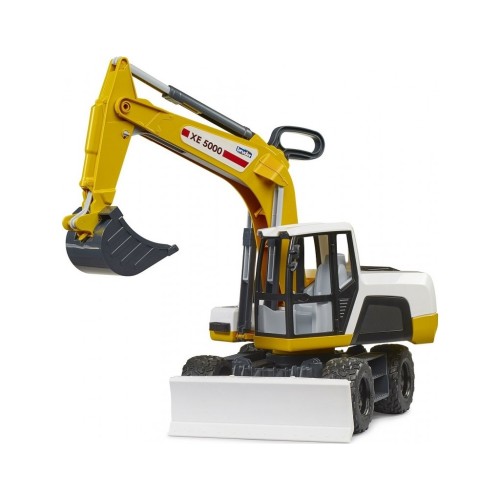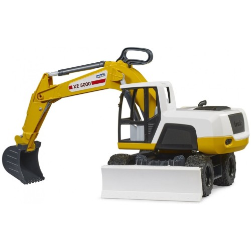 Іграшка Bruder колісний екскаватор XE 5000 з відвалом (03413) є зменшеною до масштабу 1:16 копією реальної техніки. Екскаватор має реалістичний і яскравий дизайн, цікавий функціонал і простий в управлінні. Центральна ручка може підіймати та опускати всю стрілу екскаватора та переміщувати ківш. Корпус екскаватора можна повертати на 360 °, а великий ківш регулюється по висоті. У панорамну кабіну можна посадити чоловічка з серії bWorld в якості водія. Екскаватор має плавний рух завдяки великим колесам з м'якими гумовими покришками та протектору. Маленькі любителі будівельної техніки будуть у захваті від цього екскаватора - він стане незамінним для гри в пісочниці, і чудово розвиватиме моторику, логіку та фантазію малюка.