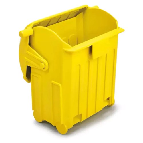 Він оснащений функцією моторизованого підйому, що піднімає жовтий бак для сміття та вивантажує його вміст у бортовий контейнер.