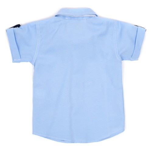 На сорочці , з лівого боку знаходиться - пришита накладна кишеня, яку прикрашає ґудзик з малюнком якоря, а також нашивка синього кольору під колір метелика.