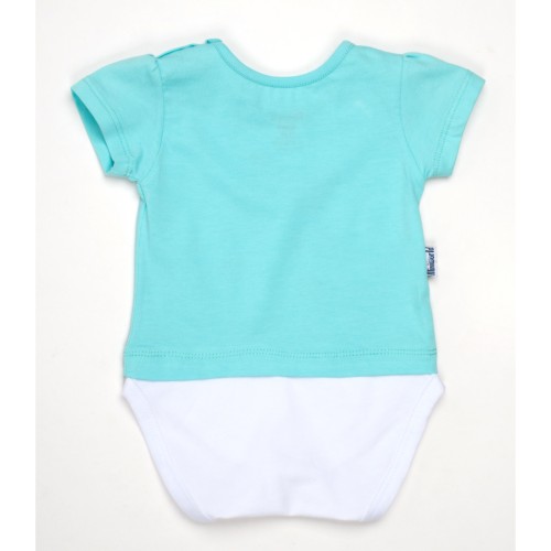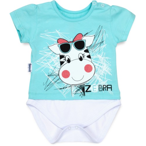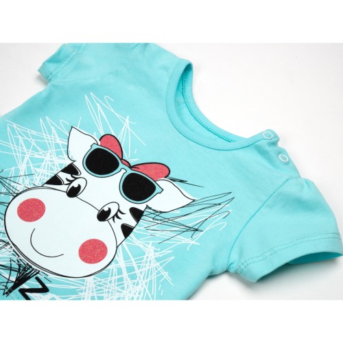 • Боді з короткими рукавами, застібкою внизу, між ніжками, та на плечевому шві на кнопочки, з круглою, неглибокою горловиною, виконаний з трикотажу у поєднанні двох приємних кольорів - м'ятного та білого, та прикрашений спереду симпатичним кольоровим принтовим веселим малюнком зебри.