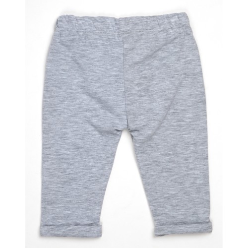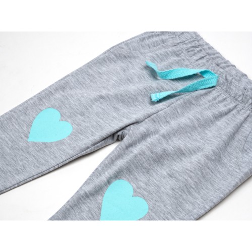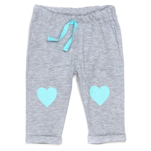 • Штанці світло-сірого кольору, з фіксованими підгорнутими манжетами по низу з основного трикотажу та зі зручною посадкою під підгузок. Без окремо вшитого поясу, на еластичній гумці всередині. Прикрашені на колінах симпатичними принтовими сердечками м'ятного кольору.