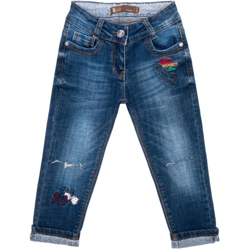 • Дуже модна та стильна стрейчева модель в стилі «5 кишень», прилягаючого покрою - Slim Fit (прилягає, але не надто обтягує), з невисокою посадкою та симпатичними підкатами знизу, прикрашена ефектними кольоровими вишивками з елементами аплікації та декоративними прорізами під колінками.