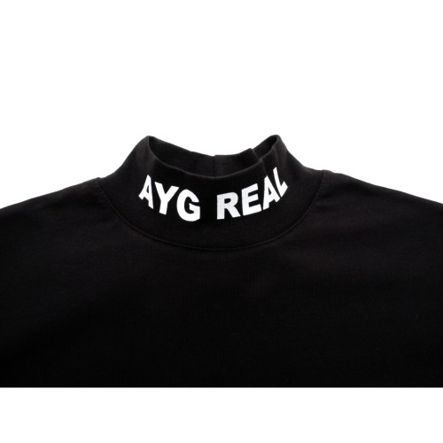 • Ефектна, трикотажна, вільна, гладко-чорна футболка прямого Т- силуету, з короткими суцільнокроєними рукавами, прикрашена на горловині стильним контрастним принтовим написом «AYG REAL»  – відмінне стильне доповнення до гардеробу вашої модниці.