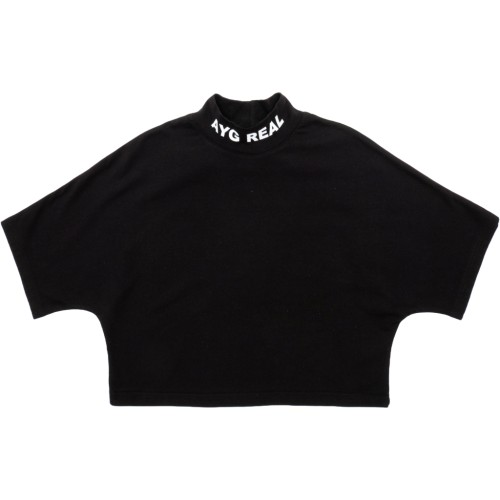 • Ефектна, трикотажна, вільна, гладко-чорна футболка прямого Т- силуету, з короткими суцільнокроєними рукавами, прикрашена на горловині стильним контрастним принтовим написом «AYG REAL»  – відмінне стильне доповнення до гардеробу вашої модниці.