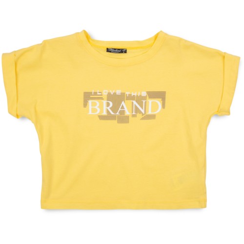 • Лаконічна укорочена футболка яскравого жовтого кольору, прикрашена на грудях ефектним принтовим написом «I LOVE THIS BRAND».