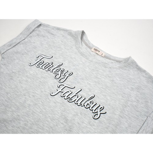 • Коротка лаконічна футболка сірого меланжевого кольору, прикрашена на грудях ефектним принтовим написом «Fearless Fabuloys» з глітерним напиленням.