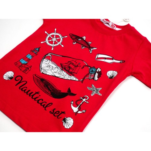 Легка трикотажна футболочка насиченого червоного кольору з малюнками на морську тематику - відмінний літній варіант для вашої дитини.