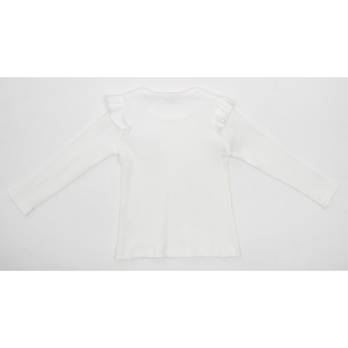 • Лонгслів прикрашений по окату рукавів гарненькими оборочками-крильцями з основного трикотажу, а на грудях - м'якенькою квіточкою-аплікацією.