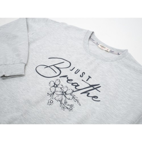 • Модний, меланжевий вільний світшот оверсайз світло-сірого кольору для дівчинки з довгими рукавами, прикрашений ефектним монохромним принтовим малюнком та сяючими дрібними сріблястими стразами.