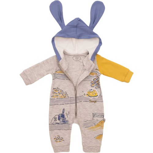 • Чудовий, затишний трикотажний комбінезон з відлітними вушками на каптурі, прикрашений спереду кольоровими принтовими малюночками та аплікацією від тм Tongs.