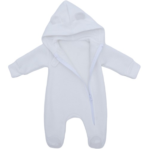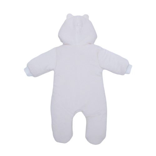 • Комбінезон виконаний в молочно-білому кольорі, з довгими рукавами на манжетах, та каптуром з милими вшитими вушками.