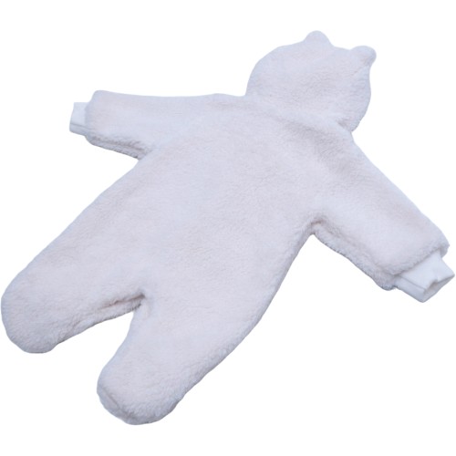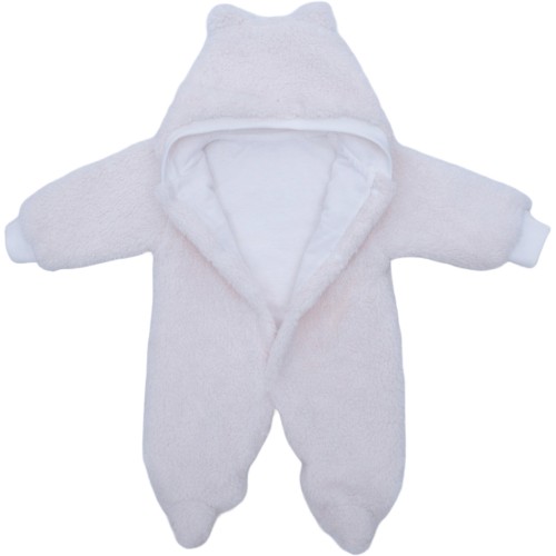 • Комбінезон виконаний в кремовому кольорі, з довгими рукавами на манжетах, та каптуром з милими вшитими вушками.