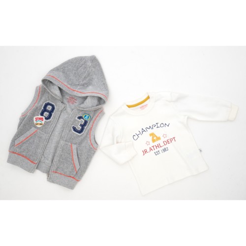 • Жилет з світло-сірого велюру з нез'ємним каптуром, на трикотажній підкладці, застібається на капронову блискавку з металевим бігунком. Вгорі є захист для підборіддя. Прикрашений пришитою аплікацією з елементами вишивки. Пройми та низ оброблені якісною, еластичною подвійною трикотажною резинкою. Спереду є дві накладні кишені, без застібки.