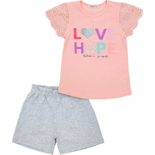 • Симпатичний трикотажний комплект для дівчинки з тонкого бавовняного турецького трикотажу (90% бавовна, 10% еластан), гладенького, якісного та приємного на дотик: персикова футболочка з ажурними рукавчиками та світло-сірі шортики.