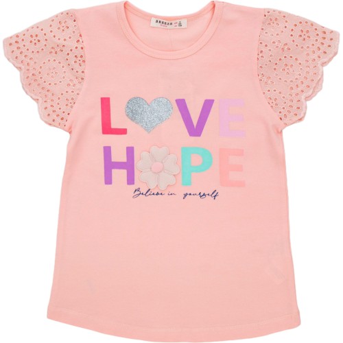 • Затишна та дуже мила футболочка з вшивними ажурними короткими рукавами з бавовняної прошви з квітковим візерунком, прикрашена спереду об'ємним кольоровим принтовим малюнком зі сріблястими глітерними деталями та відлітною акуратною аплікацією гарненької, м'якенької квіточки.