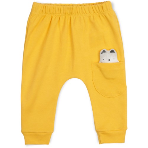 • Штанці приємного жовтого кольору, на трикотажних манжетах, зі зручною посадкою під підгузок, без окремо вшитого поясу, на еластичній гумці всередині, прикрашені на коліні накладною кишенею з аплікацією м'якенького котика.