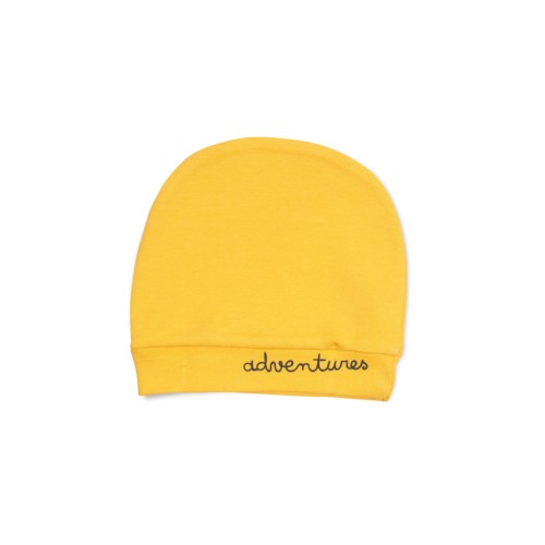 • Шапочка зручна, трикотажна, жовтого кольору в тон штанцям, без зав'язок на підборідді, на якісній подвійній трикотажній гумці, прикрашена принтовим написом.