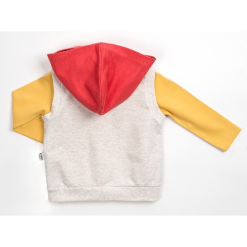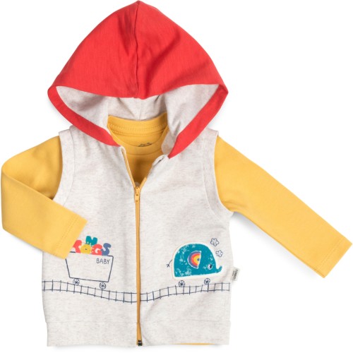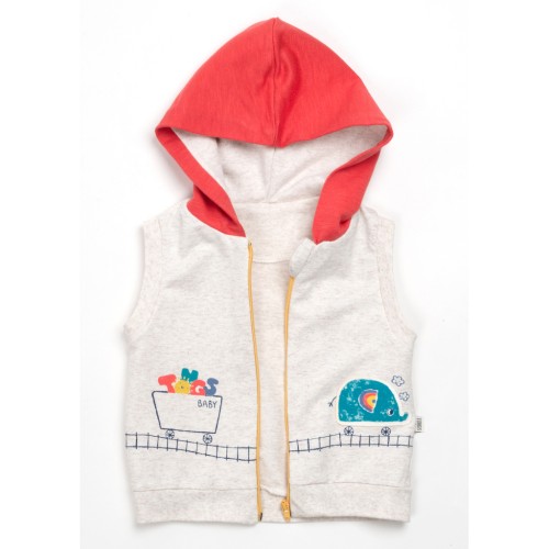 Жилет бежевого кольору з незнімним капюшоном на трикотажній підкладці. Застібається на капронову блискавку з металевим бігунком. Вгорі є захист для підборіддя. Прикрашений пришитою аплікацією та принтовими малюнками. Пройми оброблені якісною подвійною трикотажною гумкою.