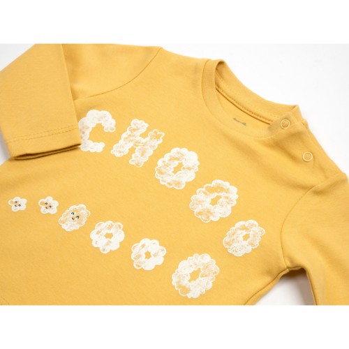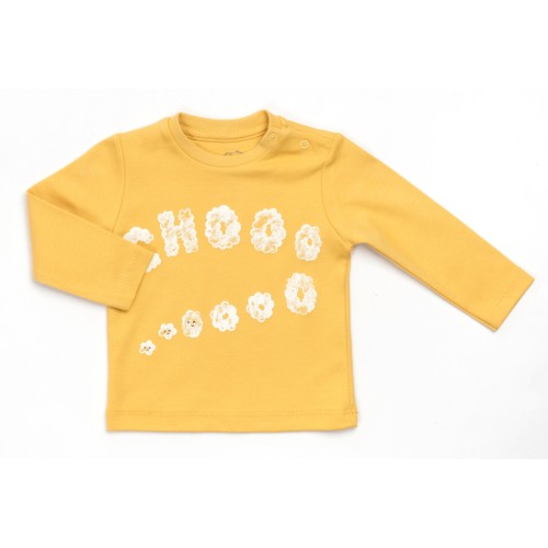Кофточка гірчичного кольору прямого силуету, з довгими рукавами. На лівому плечі виконано застібку на кнопочки. Оздоблена симпатичним принтовим малюнком.