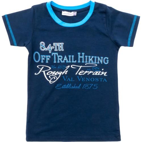 • Темно-синя футболочка прямого силуету, з круглою горловиною та коротким вшивним рукавом, прикрашена стильними об'ємними принтовими написами.